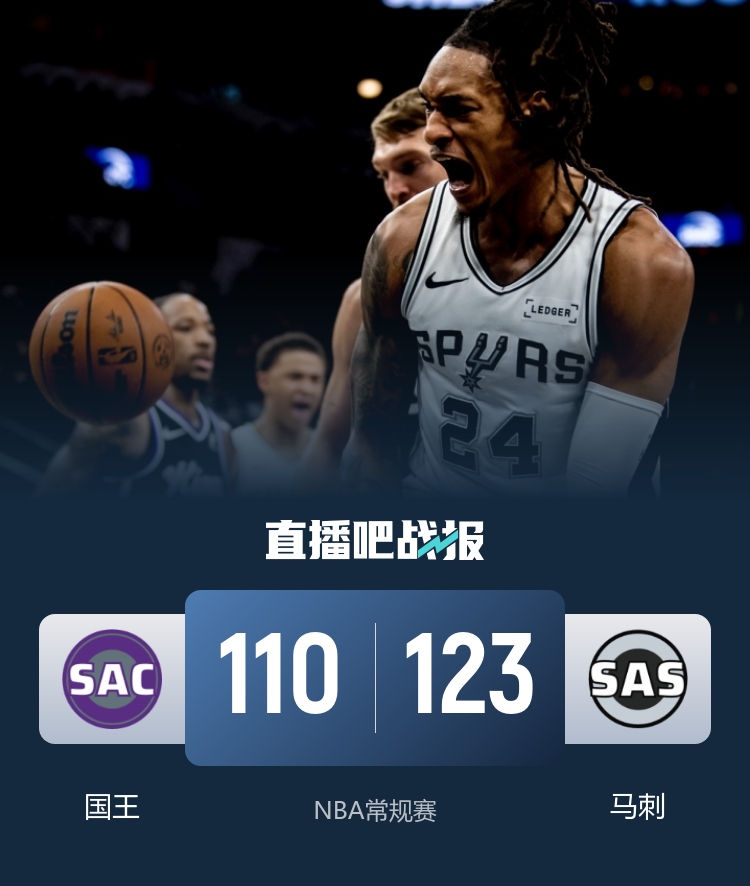 比赛开始,国王冲击内线开局,但马刺连续5记三分回应并建立主动权,随后双方连续打铁,马刺后程发力拉开双位数领先,次节德罗赞里突外投单节上双,国王一度追到个位数分差,但马刺全民皆兵能给出回应,半场还领先8分,威少总得分来到历史第18位。下半场,双方展开拉锯战,马刺多点开花一度领先到近20分,但末段国王9-0再次追到差10分,末节双方继续拉锯战,威少有攻有传还在尽力追分,但福克斯里突外投还能回应,马刺牢牢掌握住双位数领先,最终马刺123-110力克国王,送对手6连败。